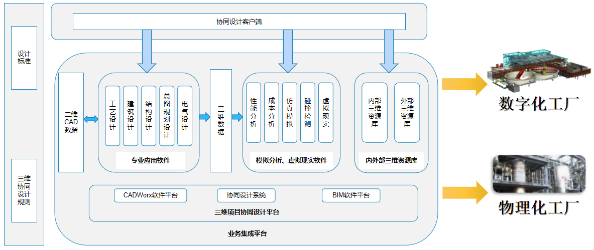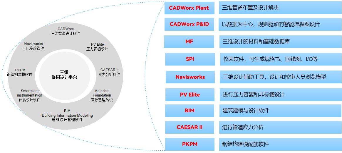 山紡設(shè)計(jì)院花巨資引進(jìn)國(guó)際先進(jìn)的三維設(shè)計(jì)軟件,管道數(shù)據(jù)以CADWorx實(shí)現(xiàn)模型化、建筑數(shù)據(jù)以BIM實(shí)現(xiàn)模型化、結(jié)構(gòu)數(shù)據(jù)以PKPM實(shí)現(xiàn)模型化、管道應(yīng)力數(shù)據(jù)以CAESAR II實(shí)現(xiàn)模型化、儀表數(shù)據(jù)以SPI實(shí)現(xiàn)模型化、工廠漫游以NAVISWORKS實(shí)現(xiàn)模型化,打通各專(zhuān)業(yè)數(shù)據(jù),實(shí)現(xiàn)數(shù)字化設(shè)計(jì)。